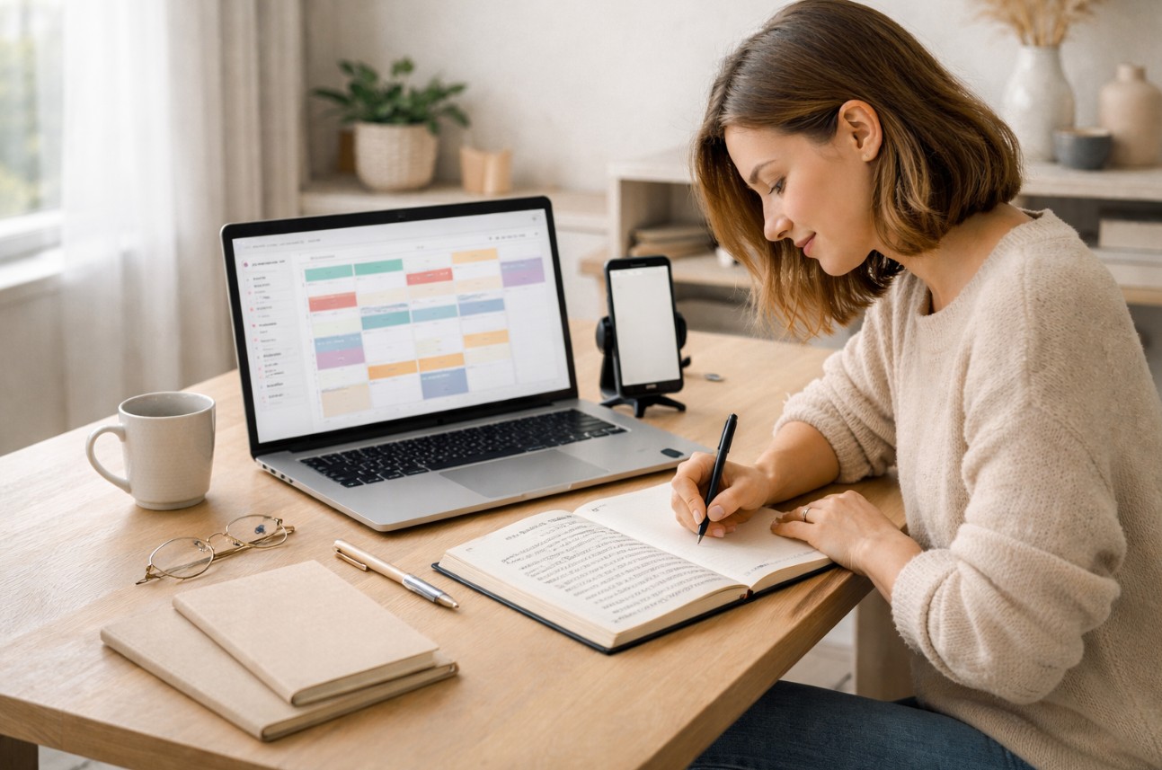 planning social media workflow and posting schedule at home